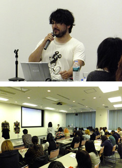 また、キャシャレル、ニナ・リッチ、イヴ・サンローランにおいて働いた実績等、様々な経歴をお持ちの方です。今回は「フランス人から見た日本のファッションとトレンド」と題し、通訳の渡辺友子氏(エスモード)のもとでの講座となりました。「日本は、着物で電車に乗っている人がいるなど伝統と日常がミックスされていたり、場所によってファッションスタイルが異なっている特徴を持つ唯一の国であり。ファッション業界では、ファッション=日本となっていて、憧れの国となっている」と話しをされていました。